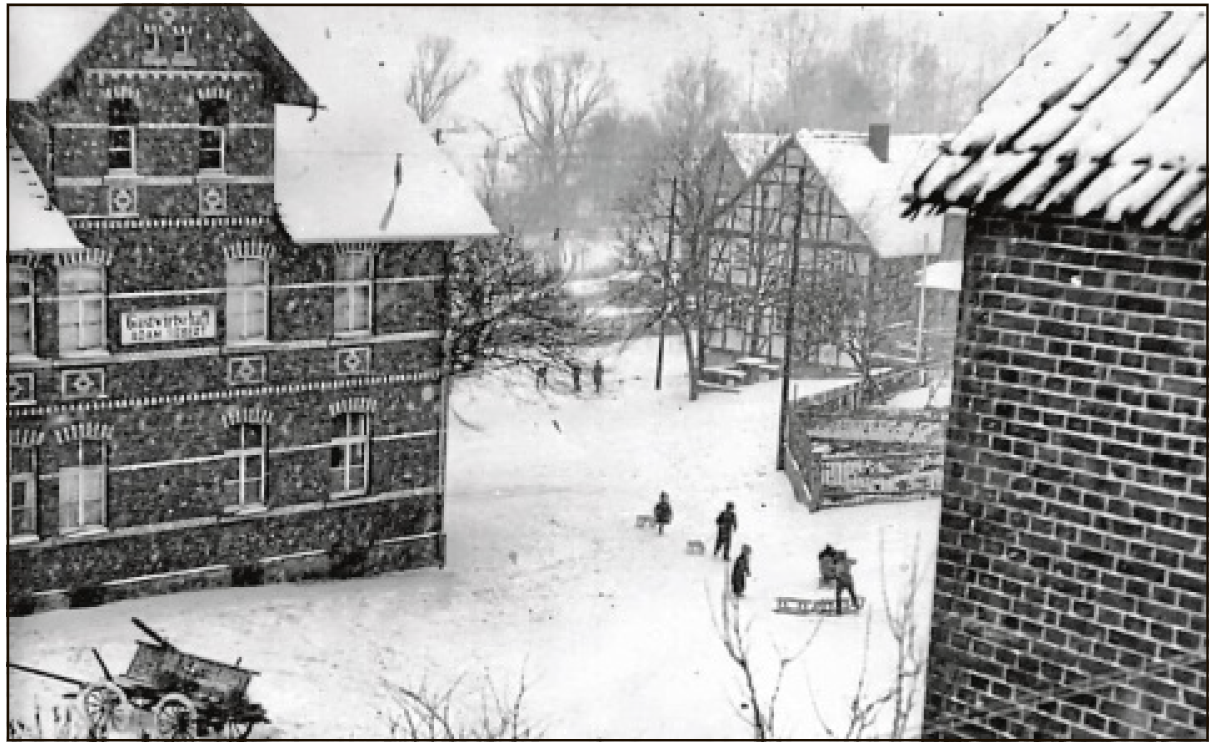 Der Hahnweg/Ortsmitte in Holzhausen diente der Dorfjugend als Schlittenbahn.