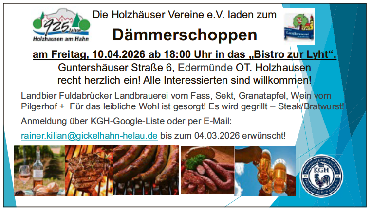 Der nächste Dämmerschoppen findet am Freitag, den 10.04.26, ab 18.00 Uhr