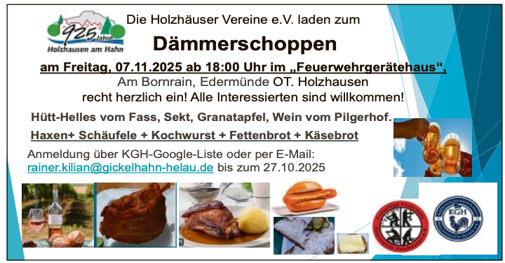 Der nächste Dämmerschoppen findet am Freitag, den 07.11.25, ab 18.00 Uhr
