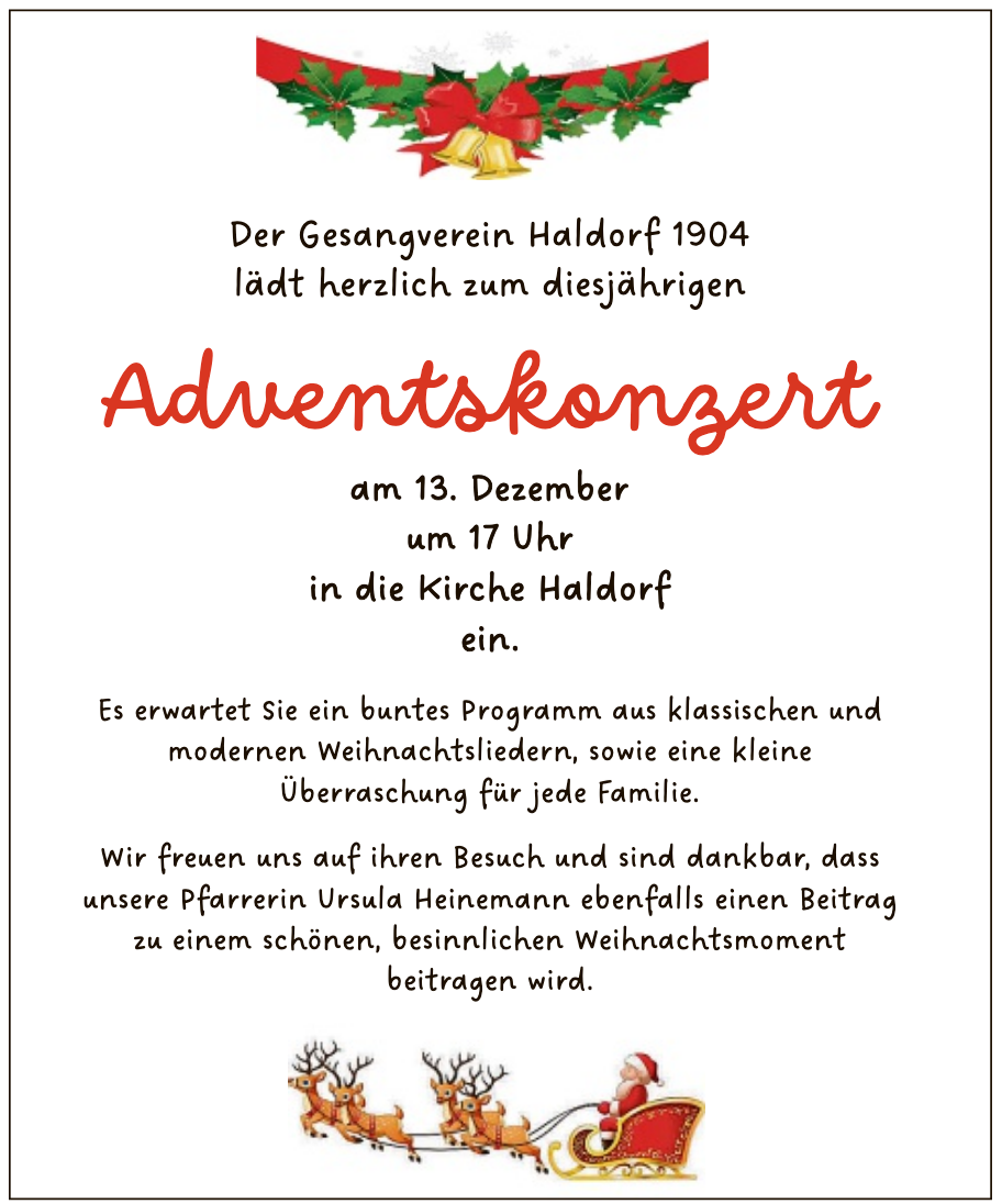 13.12.: Adventskonzert, Beginn 17 Uhr, Kirche Haldorf