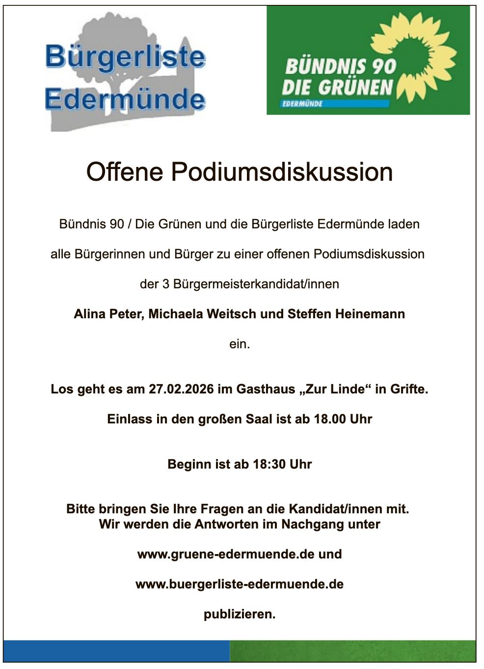 Am Fr. dem 27.02.26 wird es eine offenen Podiumsdiskussion mit allen BGM