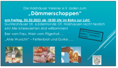 In den Herbst- und Wintermonaten findet der allmonatliche Dämmerschop- pen bis auf Weiteres wieder (immer am 1. Freitag im Monat) im Bistro „Zur Lyht“ statt; das nächste Treffen ist am Freitag, den 03.02.23, ab 18.00 Uhr. Für das leibliche Wohl wird (wie immer) gut gesorgt!- Bitte weiter sagen: ALLE Mitbürger/innen sind ganz herzlich eingeladen, zu „schnuddeln“, Spaß zu haben, einfach dabei zu sein!