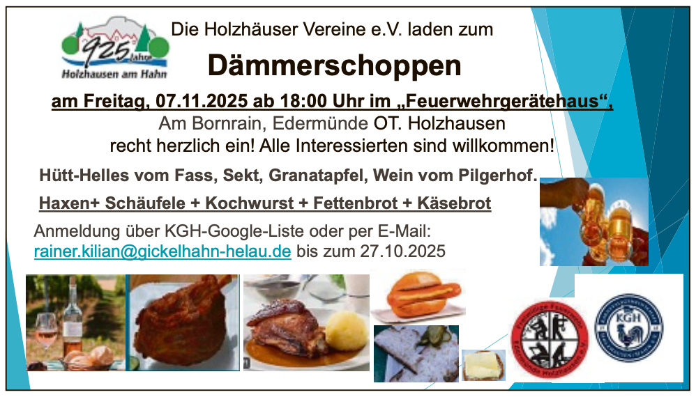 Der nächste Dämmerschoppen findet am Freitag, den 07.11.25, ab 18.00 Uhr