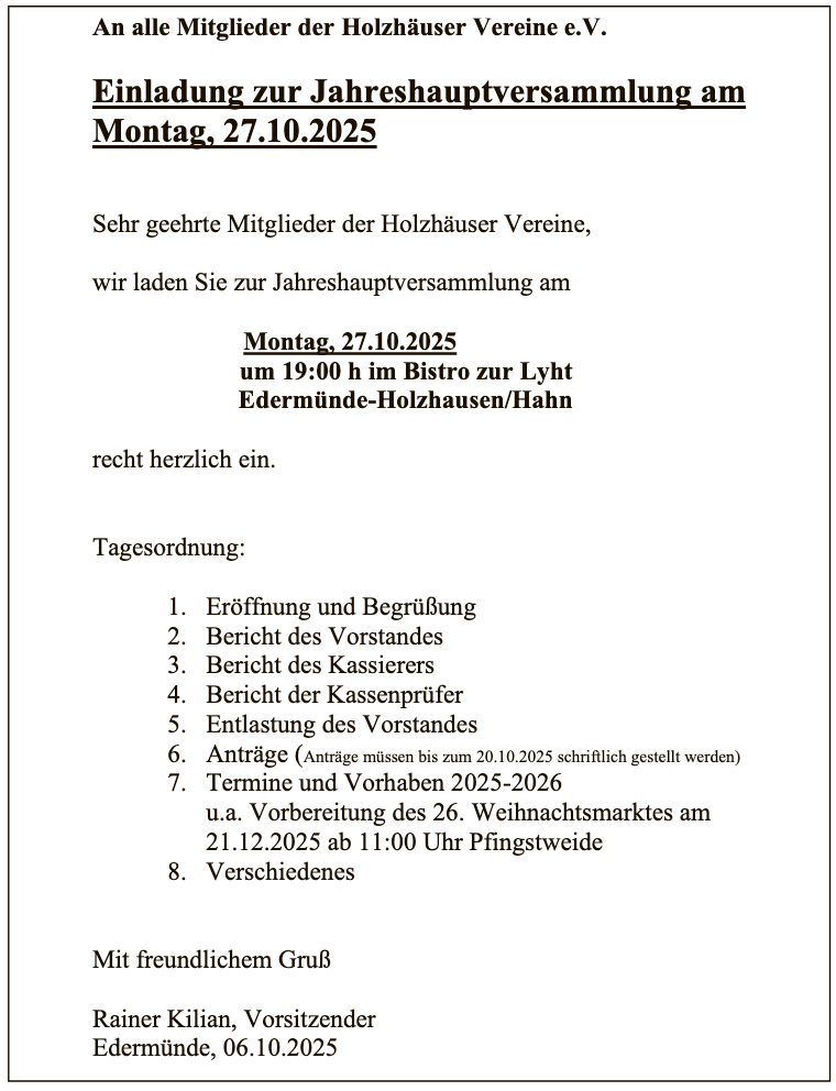 Zur Jahreshauptversammlung der Holzhäuser Vereine e.V. am Montag, den
