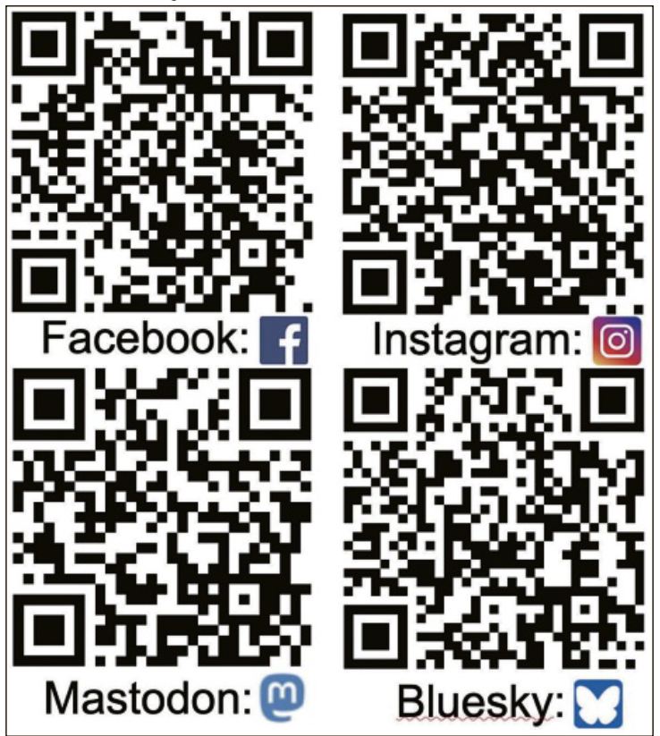 Du findest uns ab sofort auch über den nachstehenden QR-Code in den sozialen Medien "Facebook", "Instagram", "Mastodon" und "Bluesky".