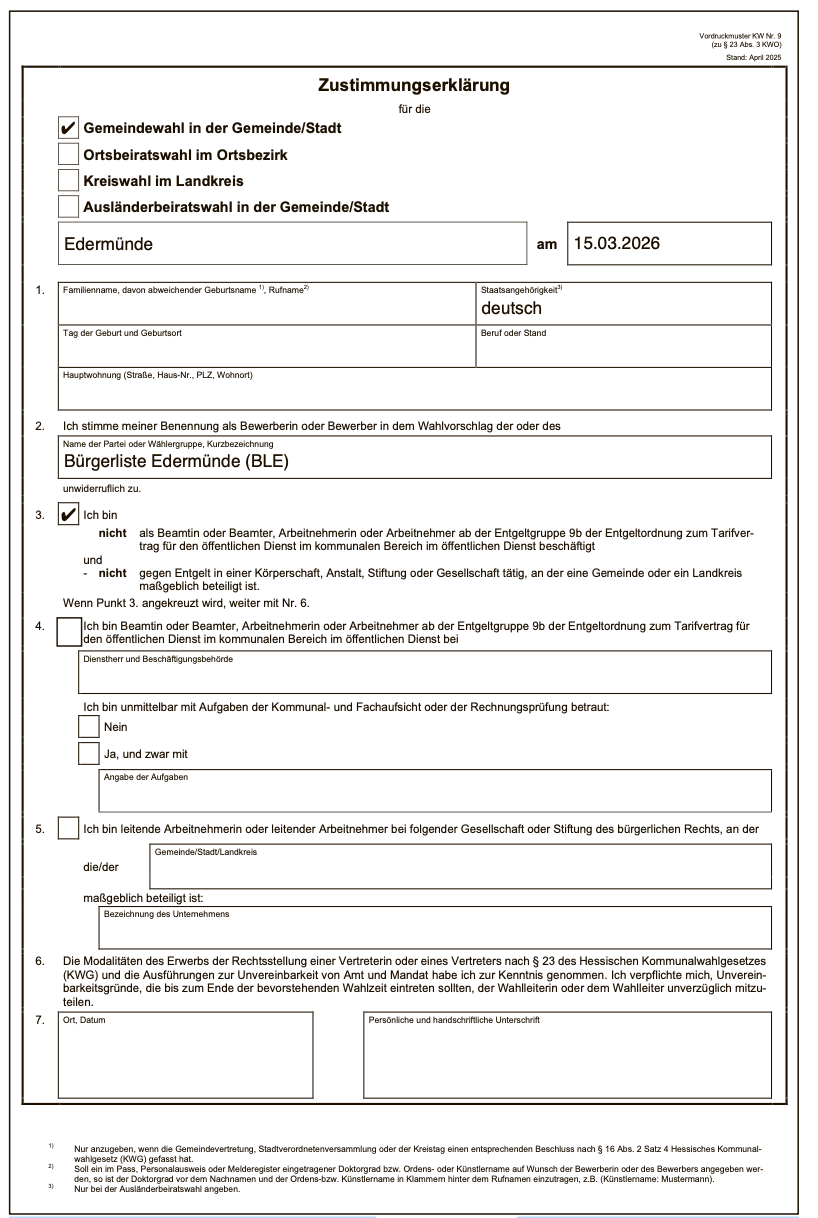 Muster einer Zustimmungserklärung. Foto: Bürgerliste Edermünde